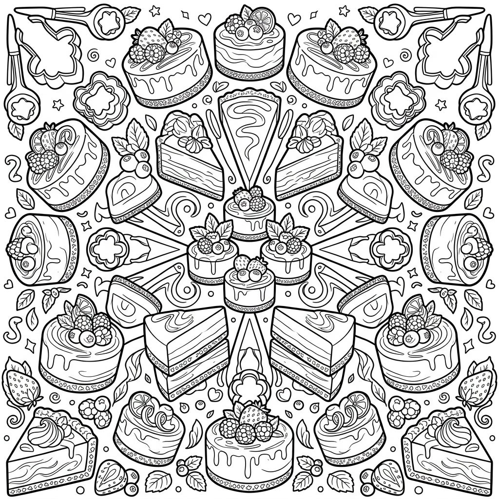 Unleash your inner pastry chef as you bring this delicious scene to life with your favorite colors. The geometric precision of the mandala, combined with the mouth-watering detail of the cheesecakes, creates a uniquely satisfying coloring experience. It's an ideal way to unwind, practice mindfulness, or simply indulge in a moment of sweet creativity, transforming black and white lines into a vibrant feast for the eyes.