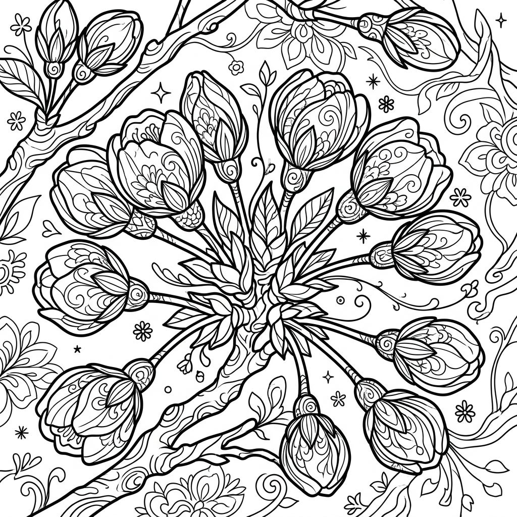 Unwind and find your artistic flow with this beautifully detailed coloring page showcasing delicate cherry blossom buds. Perfect for adults seeking a mindful and intricate coloring experience.