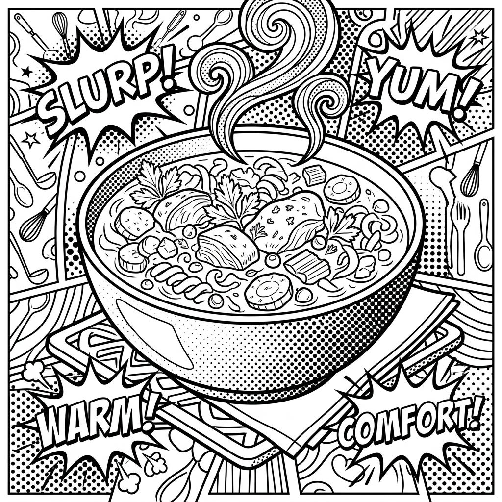 Immerse yourself in a warm, comforting bowl of chicken soup, brought to life with the bold and dynamic flair of Pop Art. This unique coloring page invites you to add vibrant hues to every ingredient and expressive detail.