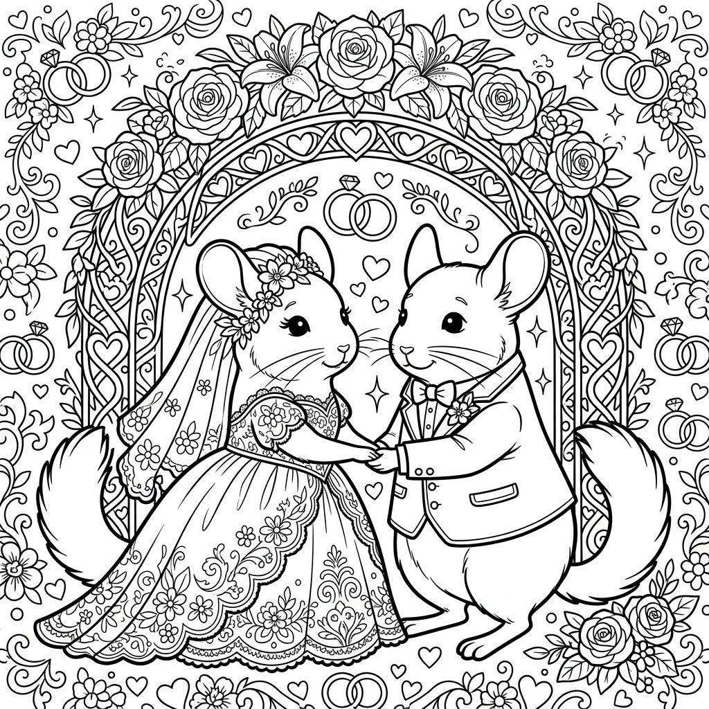 Step into a world of whimsical romance with this enchanting chinchilla wedding coloring page. Featuring two elegantly dressed chinchillas exchanging vows amidst a beautifully decorated floral arch, it's perfect for celebrating love and creativity.