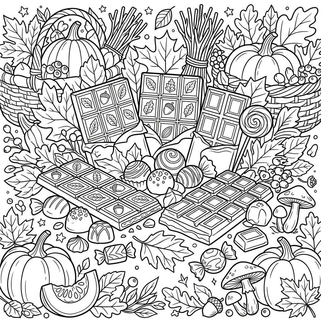 Dive into the cozy delights of autumn with this bountiful coloring page featuring an array of delicious chocolates and candies. Surrounded by festive pumpkins, crisp leaves, and harvest elements, this scene offers a sweet artistic escape.