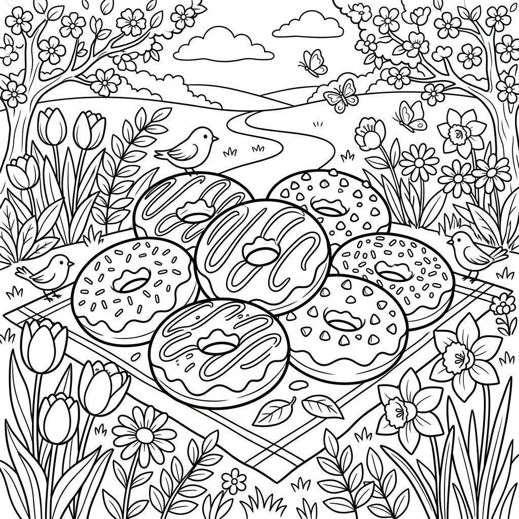 Step into a charming spring scene where a delightful array of chocolate doughnuts awaits your artistic touch. This intricate coloring page showcases seven mouth-watering doughnuts, each adorned with unique icing patterns and sprinkles, nestled invitingly on a checkered picnic blanket. Surrounding these sweet treats, you'll find a vibrant tapestry of nature, from budding tulips and graceful daffodils to cherry blossoms adorning nearby trees, creating a feast for the eyes even before adding color.