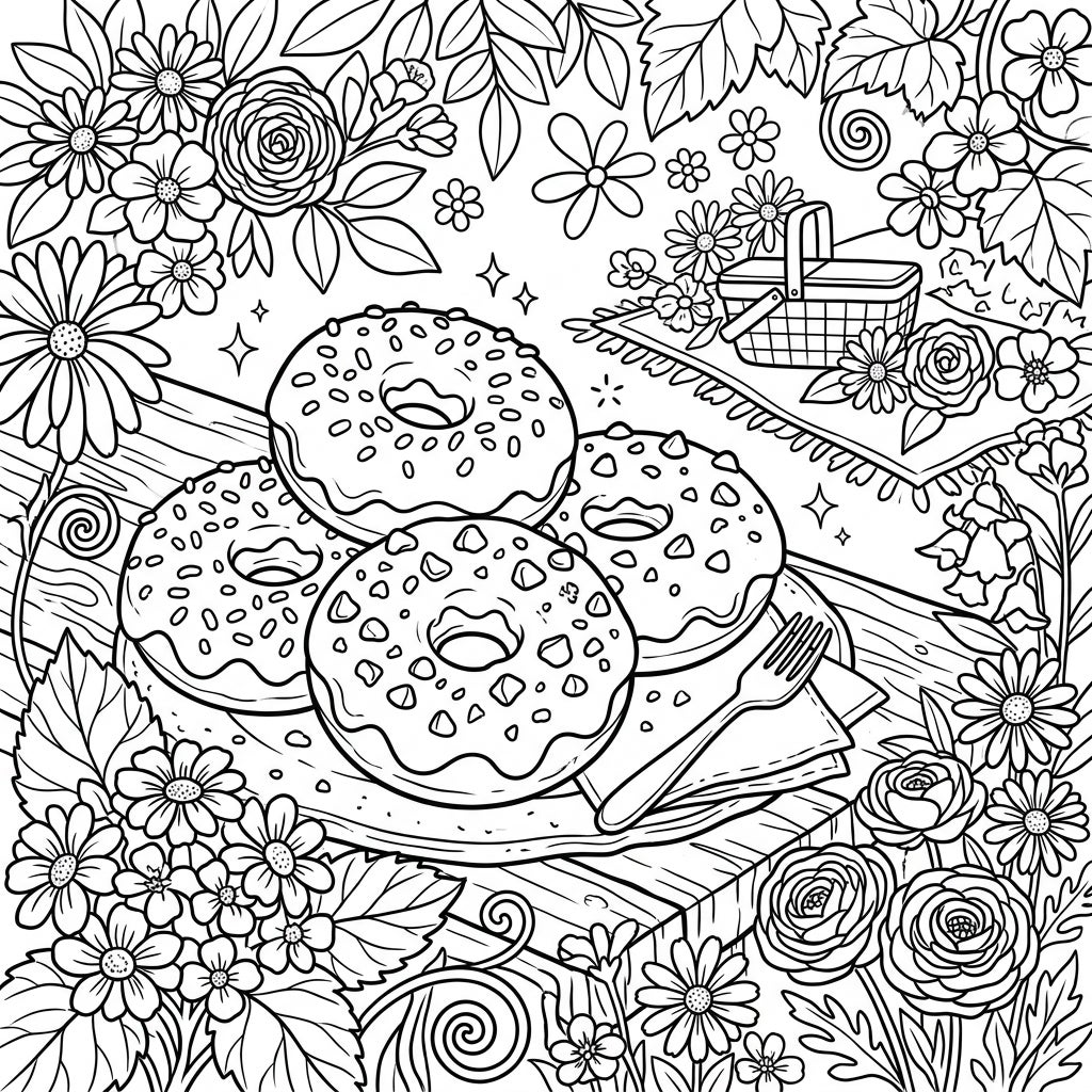 This intricate coloring page invites you to a delightful spring picnic, centered around a tempting plate of four generously glazed chocolate doughnuts. Each doughnut is adorned with unique toppings, from classic sprinkles to tempting chocolate chips, resting on a simple plate with a fork and napkin. The entire scene is framed by an abundance of detailed spring flora, including cheerful daisies, elegant roses, and various leaves, all contributing to a rich, immersive backdrop that promises hours of coloring fun.