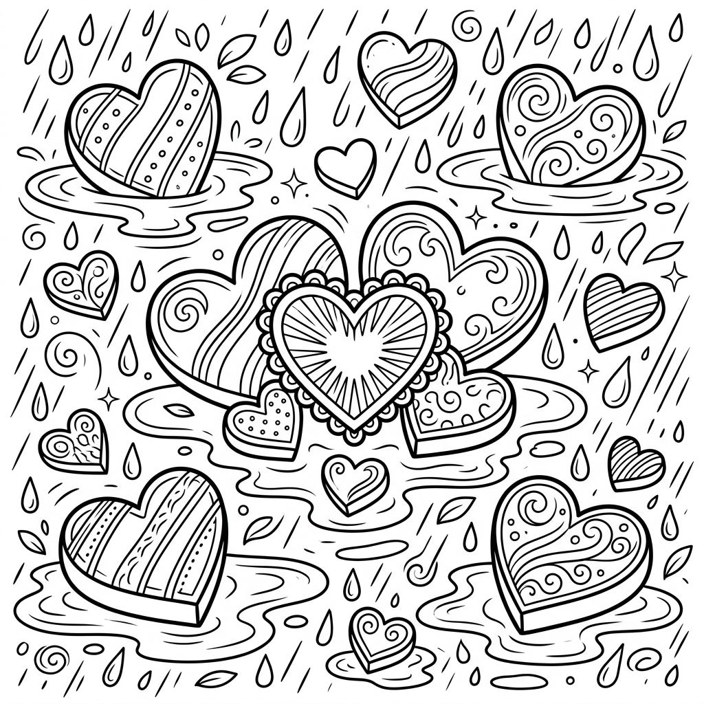 Discover a charming array of decorated chocolate hearts scattered amidst a gentle rain shower. This delightful coloring page combines sweetness with the serene beauty of a rainy day, offering intricate patterns and a cozy atmosphere for creative relaxation.