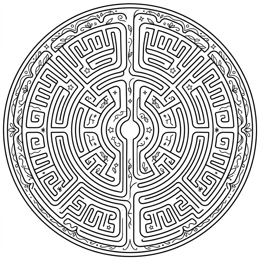 Embark on a captivating coloring adventure with this exquisite circular labyrinth design. The intricate pattern showcases a mesmerizing maze of pathways, meticulously enclosed within a graceful circular boundary. Adorning the outer ring, delicate vines, leaves, and twinkling stars create a classical and almost magical border, hinting at ancient wisdom and natural beauty.