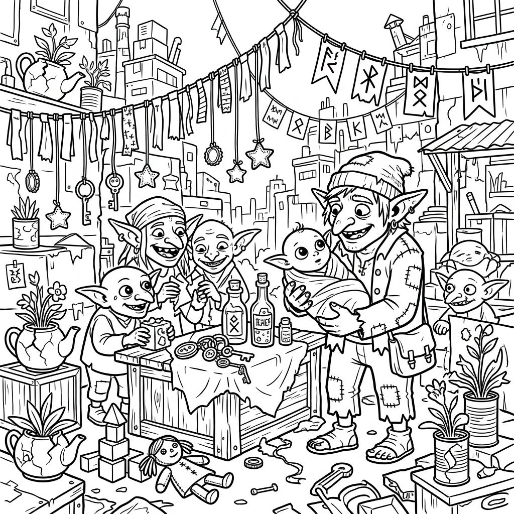 The atmosphere of this unique baby shower is playfully chaotic, reflecting the resourceful nature of City Goblins. Notice the inventive decorations: banners made from scraps, old keys and bottle caps dangling, and teapots transformed into planters. Every detail tells a story of community and celebration, making this a truly memorable and endearing scene to bring to life with color.