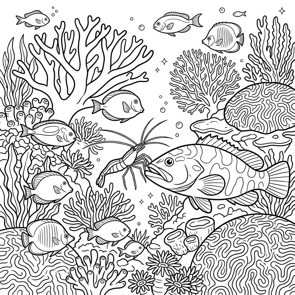 Immerse yourself in a spectacular underwater tableau with our 'Cleaner Shrimp Coral Reef Full Scene' coloring page. This intricate design meticulously captures the dynamic ecosystem of a coral reef, with a fascinating cleaner shrimp at its heart, performing its essential role alongside a large, attentive fish. Surrounding them is a vibrant tapestry of marine life: schools of smaller fish, delicate sea anemones, and diverse coral formations, all rendered in exquisite detail to create a truly immersive experience that fills the entire frame.