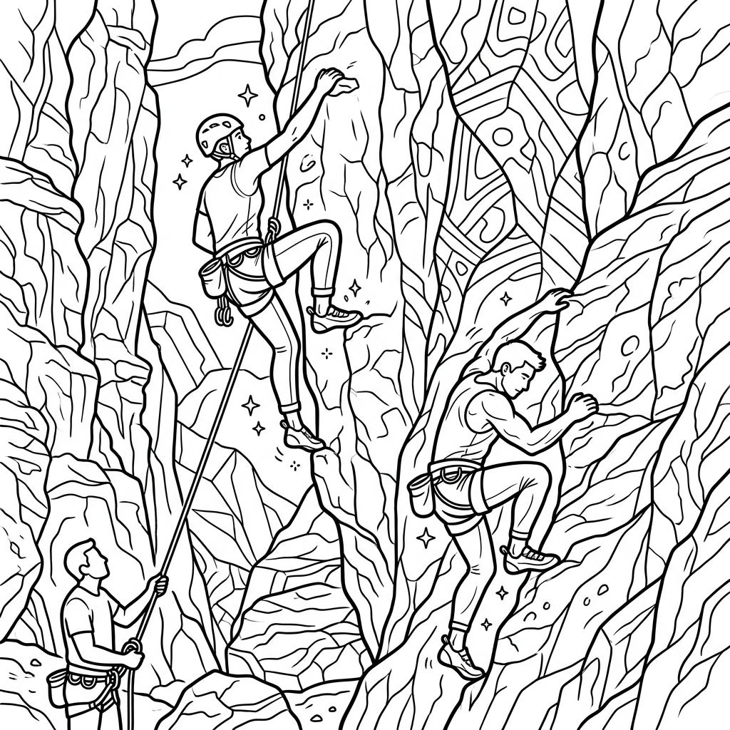 Unleash your creativity and make this climbing scene truly pop! Consider using earthy tones like browns, grays, and moss greens for the diverse rock textures, adding depth with darker shades for crevices and highlights for exposed surfaces. Experiment with different colors for the climbers' gear and clothing, perhaps bright, contrasting shades to make them stand out against the natural backdrop. Don't forget to add varied skin tones and use shading to give their muscles and forms a realistic, three-dimensional feel, transforming this outline into a masterpiece of movement and light.