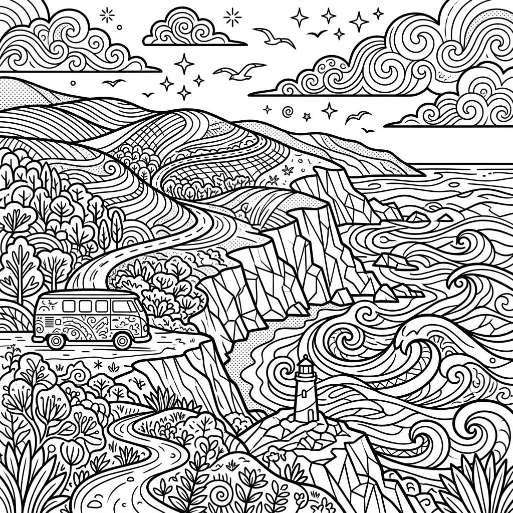 Unleash your inner artist with endless coloring possibilities for this Pop Art masterpiece. Experiment with contrasting colors to amplify the comic-book feel, perhaps using vibrant primaries or bold neons for the van and natural, yet striking, tones for the valleys and ocean. Consider using different shading techniques to add depth to the stylized cliffs and waves, or blend colors within the intricate patterns of the hills. Don't be afraid to add your own creative patterns or details to truly make this Coastal Valleys scene pop with your unique artistic vision.