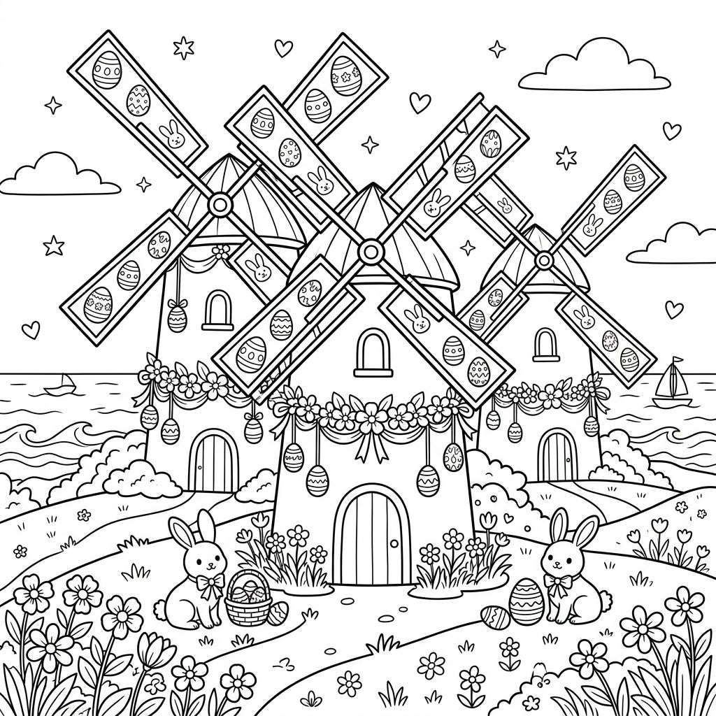 Immerse yourself in this wonderfully detailed coloring page, showcasing a picturesque coastal landscape where three charming windmills stand proudly by the sea. Each windmill is beautifully adorned with festive Easter garlands, intricately designed hanging eggs, and cheerful bunny faces gracing their blades. In the foreground, two adorable bunnies are nestled among a vibrant array of spring flowers, one tending to a basket overflowing with decorated eggs, while the other playfully guards a single patterned egg. The background reveals a serene ocean dotted with sailboats and a sky speckled with gentle clouds, hearts, and stars, inviting you to explore every delightful detail.