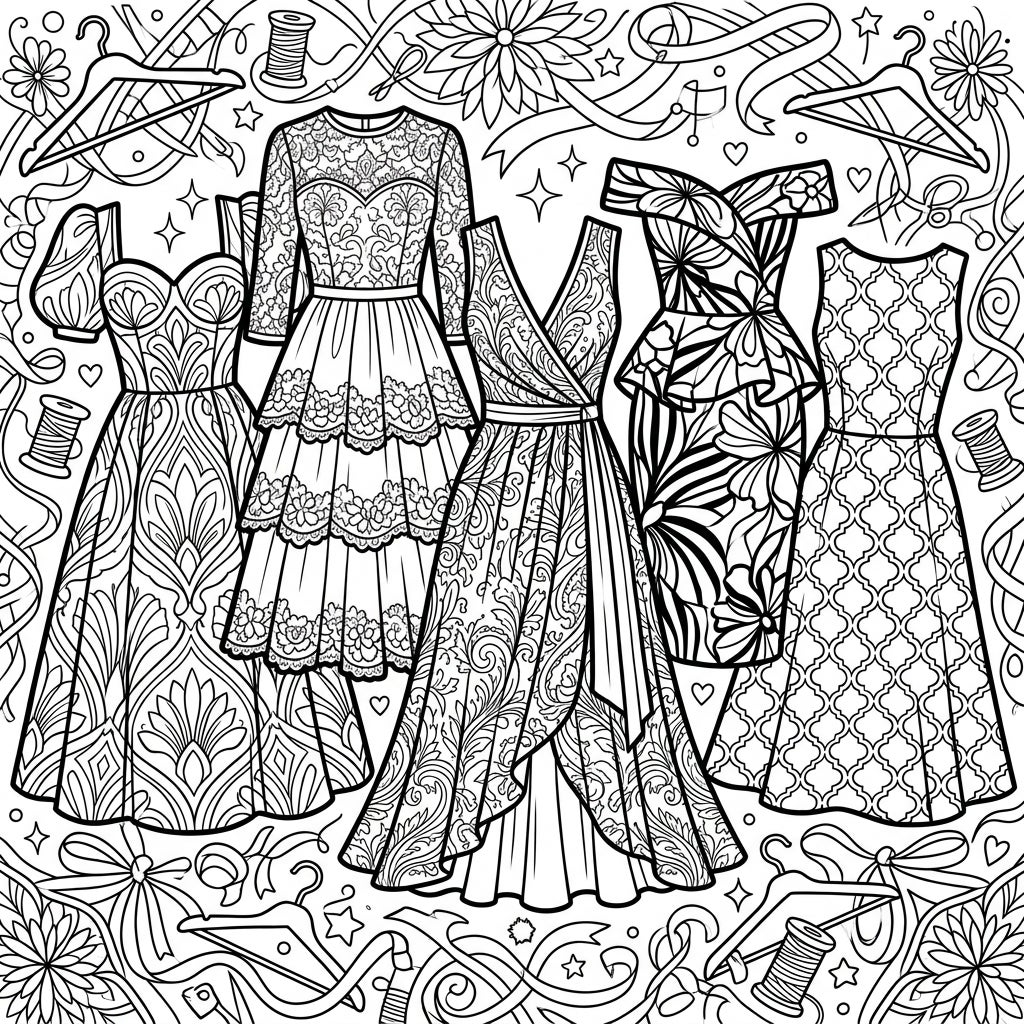 Elevate your coloring experience by paying attention to the rich textures and patterns within each dress. Experiment with shading to create depth in the lace and ruffles, and use complementary colors to highlight the intricate motifs. Don't forget the delightful background, filled with fashion-inspired elements like spools of thread, ribbons, hangers, and delicate flowers, which offer additional opportunities for detailed coloring and personalization. This page is perfect for both adult coloring enthusiasts and aspiring fashion designers.