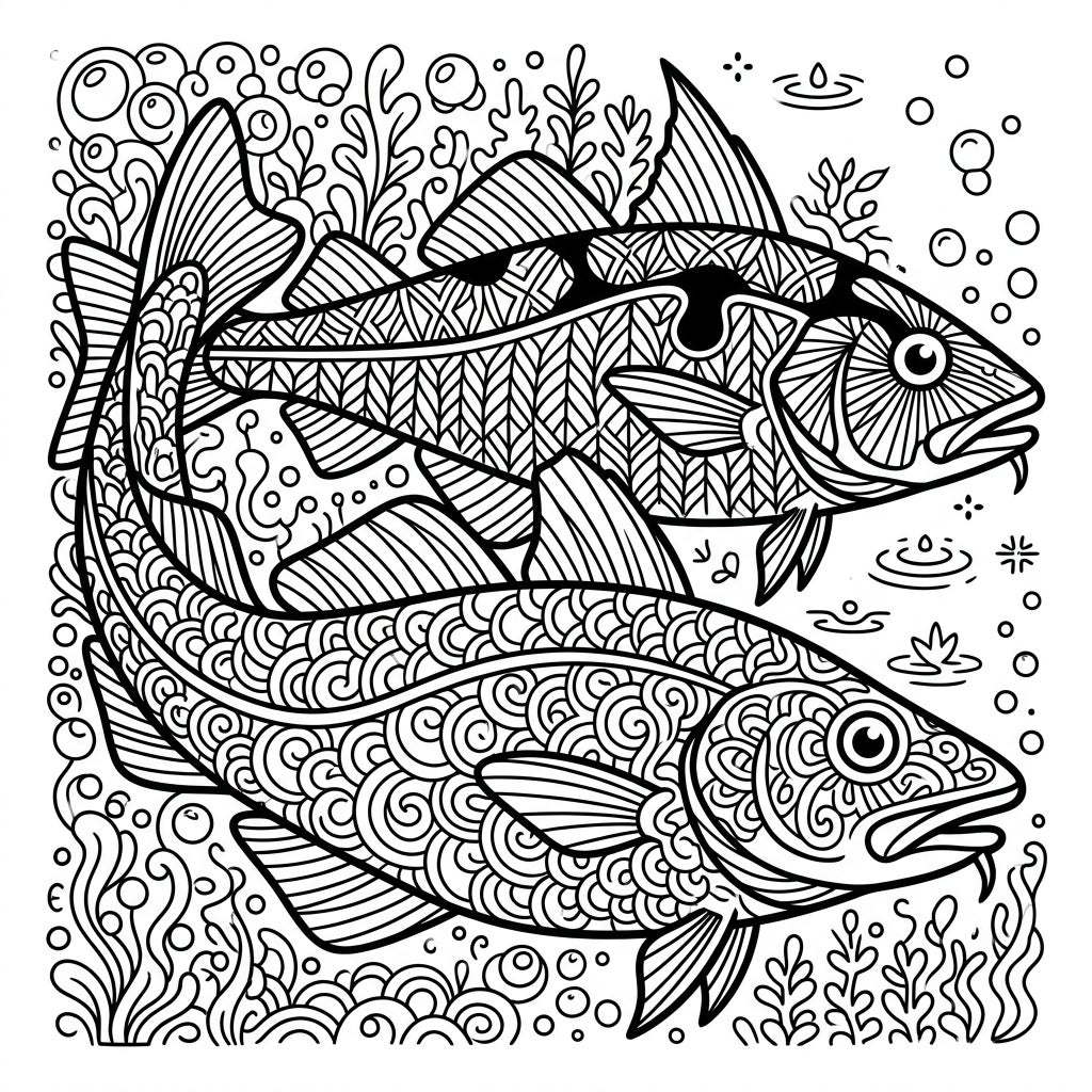 Immerse yourself in the captivating world beneath the waves with our Zentangle Cod & Haddock coloring page. This intricate design showcases two magnificent fish, likely a cod and a haddock, swimming gracefully amidst a busy aquatic environment. Every detail, from their textured scales to their flowing fins, is transformed into a canvas of complex Zentangle patterns, inviting you to explore a world of line art and imagination.