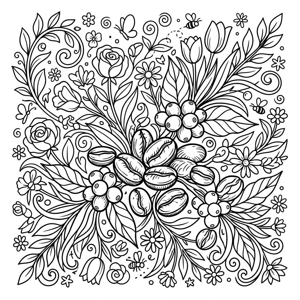 Dive into a harmonious blend of nature's beauty and your favorite brew with this intricate coloring page. At its heart, a cluster of detailed coffee beans, complete with their signature central groove, serves as an earthy anchor. They are artfully encircled by a flourishing array of spring flora, including elegant roses, delicate tulips, cheerful daisies, and a variety of leaves and swirling vines, creating a rich tapestry of organic forms.