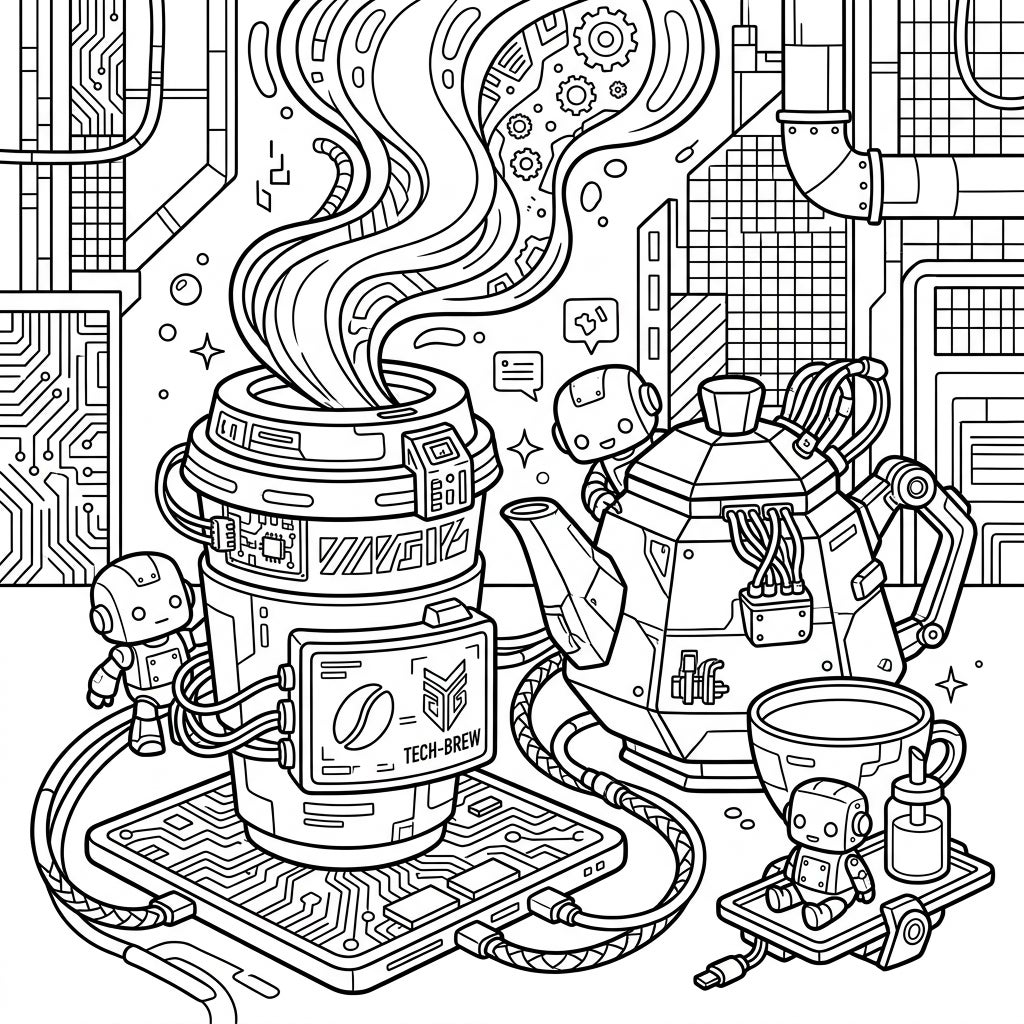 Unleash your creativity as you bring this scene to life. Consider vibrant neon colors for the glow outlines and circuitry to really make the cyberpunk elements pop, contrasting with warm, rich browns and amber for the coffee and tea. Experiment with metallic shades for the robots and teapot, and use lighter tones or subtle shading to emphasize the steam rising from the beverages. This coloring page offers endless possibilities to craft a masterpiece that is both cozy and cutting-edge.