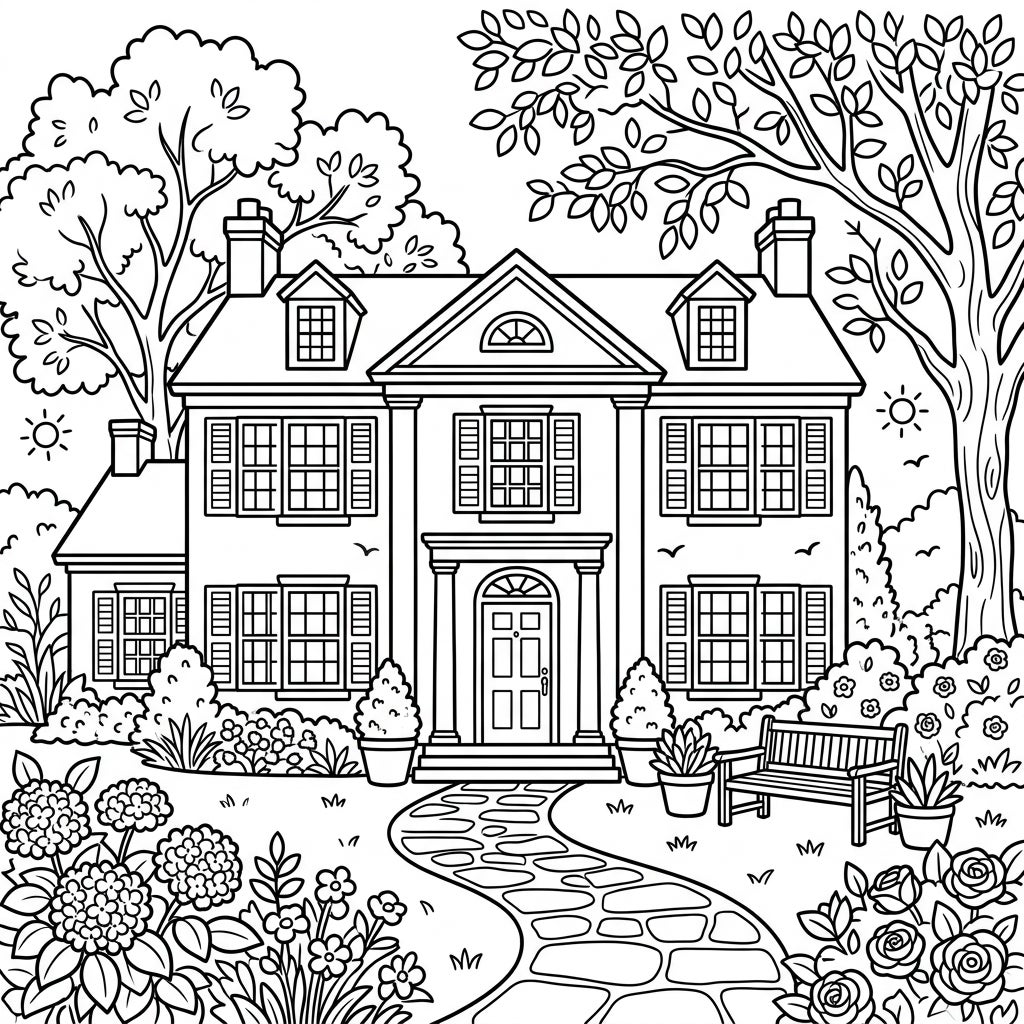Immerse yourself in the timeless elegance of a Colonial Mansion, beautifully rendered for your coloring pleasure. This intricate design showcases a majestic, symmetrical home, complete with multi-paned windows, elegant shutters, and a welcoming front entrance. A charming stone path leads through a meticulously detailed garden, brimming with ornate bushes, potted plants, and mature trees that frame the impressive structure, offering a wealth of delightful details to color.