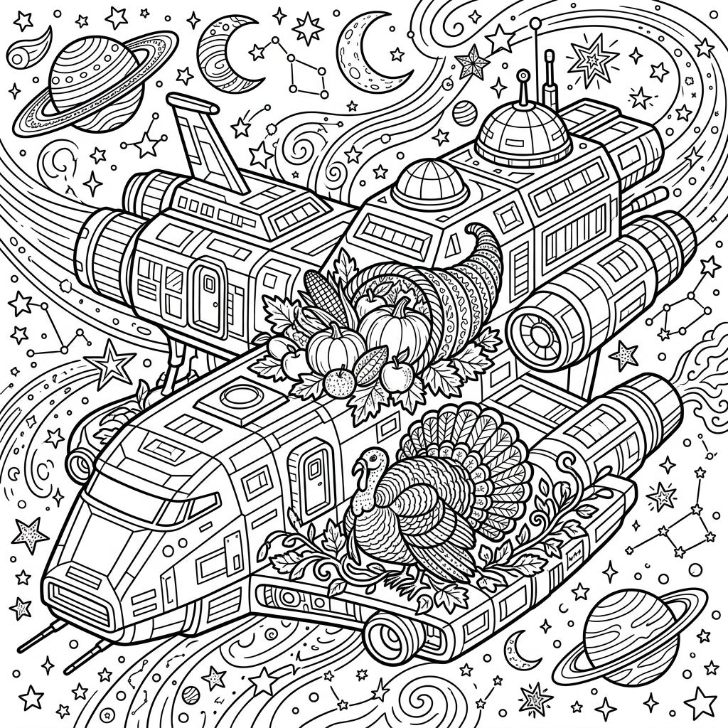 Embark on an extraordinary coloring odyssey with this intricate design featuring a grand colony ship soaring through the cosmos. This impressive vessel, intricately detailed with various panels, engines, and domes, serves as a canvas for a truly unique celebration. Perched upon its surface are classic Thanksgiving symbols: a lavish cornucopia overflowing with plump pumpkins, ripe apples, golden corn, and juicy grapes, alongside a magnificent, elaborately feathered turkey, ready for a space-age feast. The background enhances the cosmic theme with swirling nebulae, twinkling stars, crescent moons, and distant planets, inviting you to explore every corner with your favorite colors.