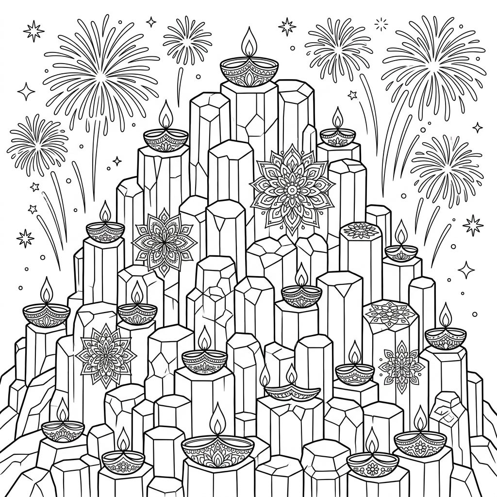 Discover a truly unique fusion of nature's wonder and festive joy with this intricate coloring page. Featuring majestic columnar jointing rocks adorned with beautiful Diwali diyas, rangoli patterns, and sparkling fireworks, it promises a creative celebration.