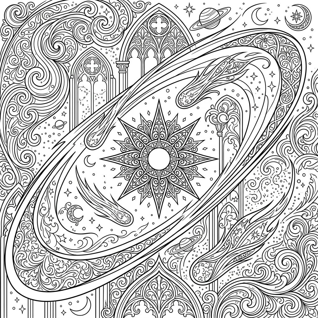 Immerse yourself in a universe where the cosmos meets timeless Gothic elegance. This exquisite coloring template presents a stunning central star, adorned with intricate mandala-like patterns, surrounded by a dynamic dance of comets streaking across the celestial canvas. Discover delicate moons, distant planets, and countless shimmering stars nestled among swirling nebulae, all waiting to be brought to life with your chosen palette.