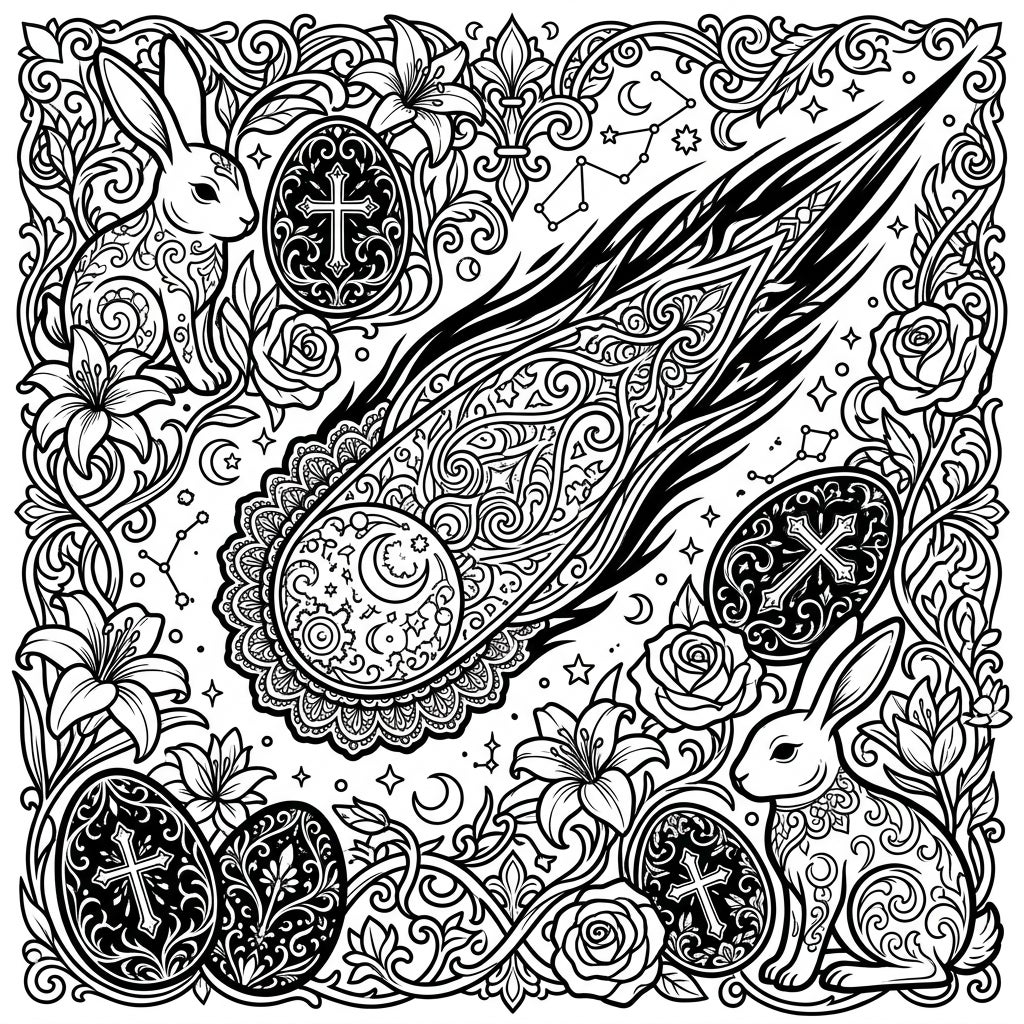 Prepare your palette for a journey into rich textures and captivating details. Consider a blend of deep jewel tones—amethyst, sapphire, and emerald—to bring out the gothic grandeur, perhaps accented with metallic silver or gold for the comet and egg details. Or, defy expectations with a vibrant, contrasting burst of color for the Easter elements against a darker celestial backdrop. Every line, from the swirling comet to the delicate bunny fur and ornate eggs, invites careful attention and endless artistic possibilities.