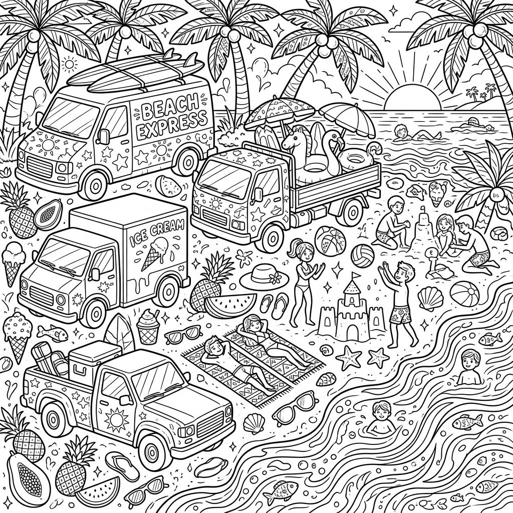 This richly packed template offers endless opportunities for creative expression. Bring the vehicles to life with bold, contrasting colors, or give them a classic, sun-faded look. Experiment with vibrant blues and greens for the ocean, warm yellows and oranges for the sunset, and tropical hues for the fruits and inflatables. Whether you prefer bright, cheerful tones or subtle pastels, this coloring page promises hours of relaxing and imaginative fun for all ages.