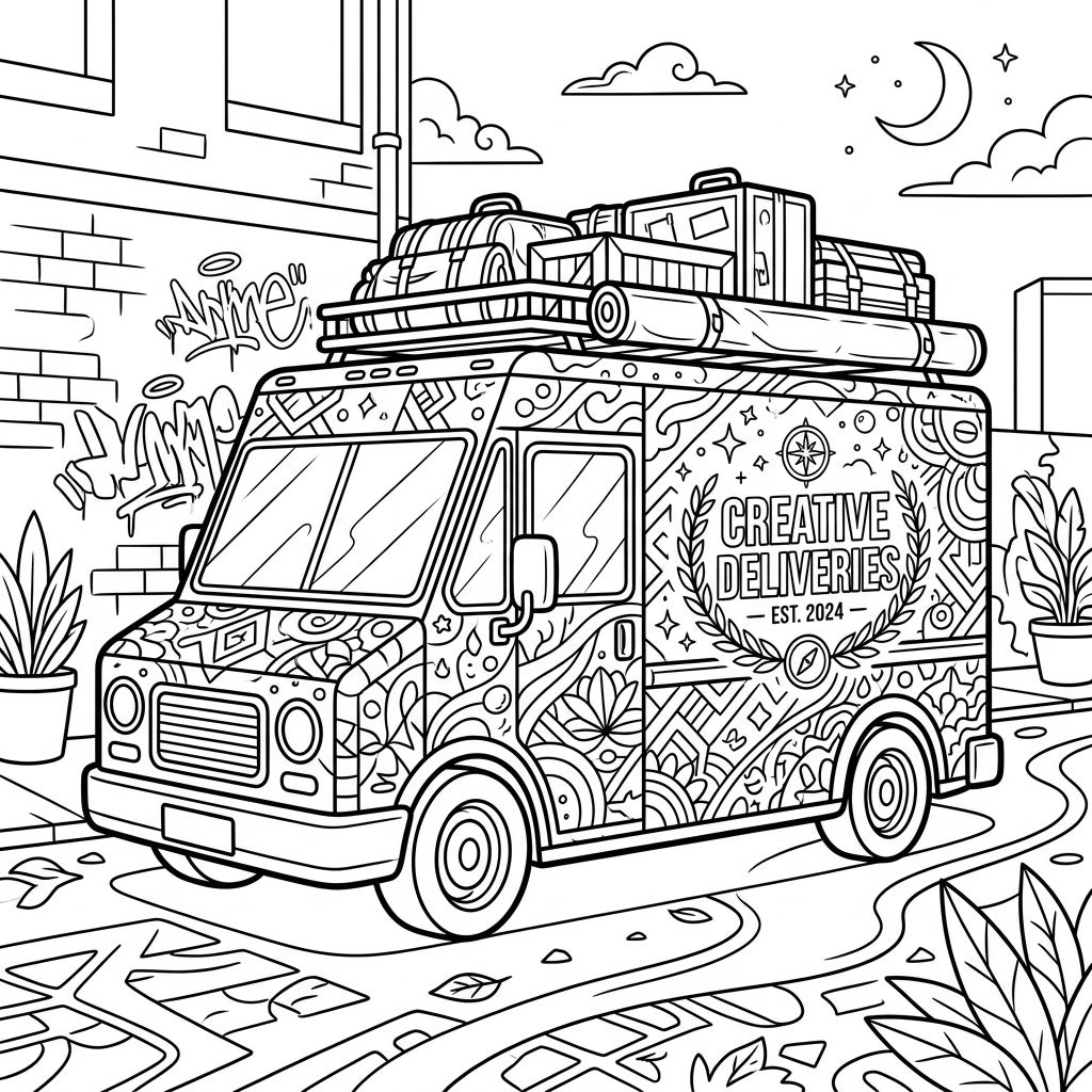 Get ready to rev up your artistic engines with this incredibly detailed delivery van coloring page, perfect for teens who love urban art and creative challenges. Every inch of this commercial vehicle is adorned with complex, trendy patterns, making it a true masterpiece in the making. From the stylized 'Creative Deliveries Est. 2024' logo to the luggage packed on its roof rack, there's a wealth of fascinating details just waiting for your personal touch.