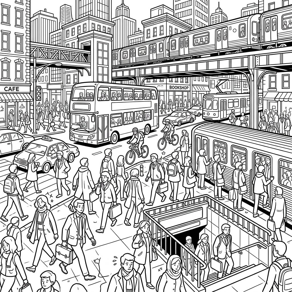 Capture the vibrant energy of a metropolitan rush hour with this intricate coloring page. Dive into a detailed urban landscape filled with commuters, diverse public transportation, and towering city buildings, ready for your creative touch.