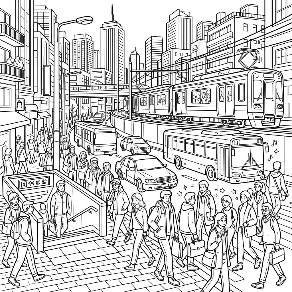 This coloring template perfectly encapsulates the energetic rhythm of urban living, offering a glimpse into the organized chaos and constant motion of a bustling city. It evokes the daily journey shared by millions, highlighting the interconnectedness of public transport and the flow of humanity in an active urban environment. As you color, you can almost hear the distant hum of traffic and the quiet chatter of passersby, transforming a mundane commute into a canvas for your imagination.
