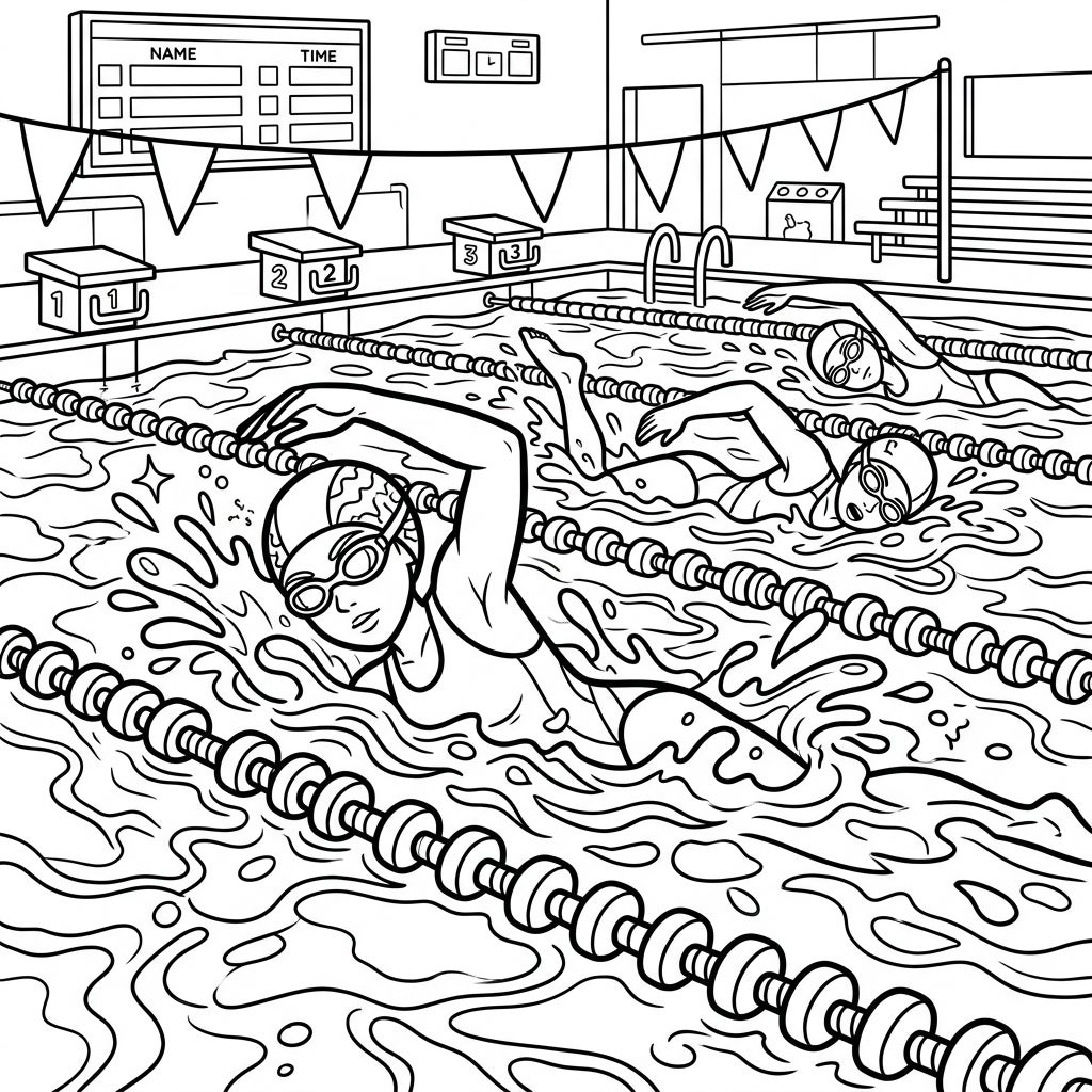 Dive into the thrilling world of competitive swimming with this engaging coloring page! It features a vibrant race scene, showcasing young swimmers powerfully gliding through the water, creating dynamic splashes. The detailed background includes numbered starting blocks, lane lines, a visible scoreboard, and poolside elements, all waiting for your creative touch.