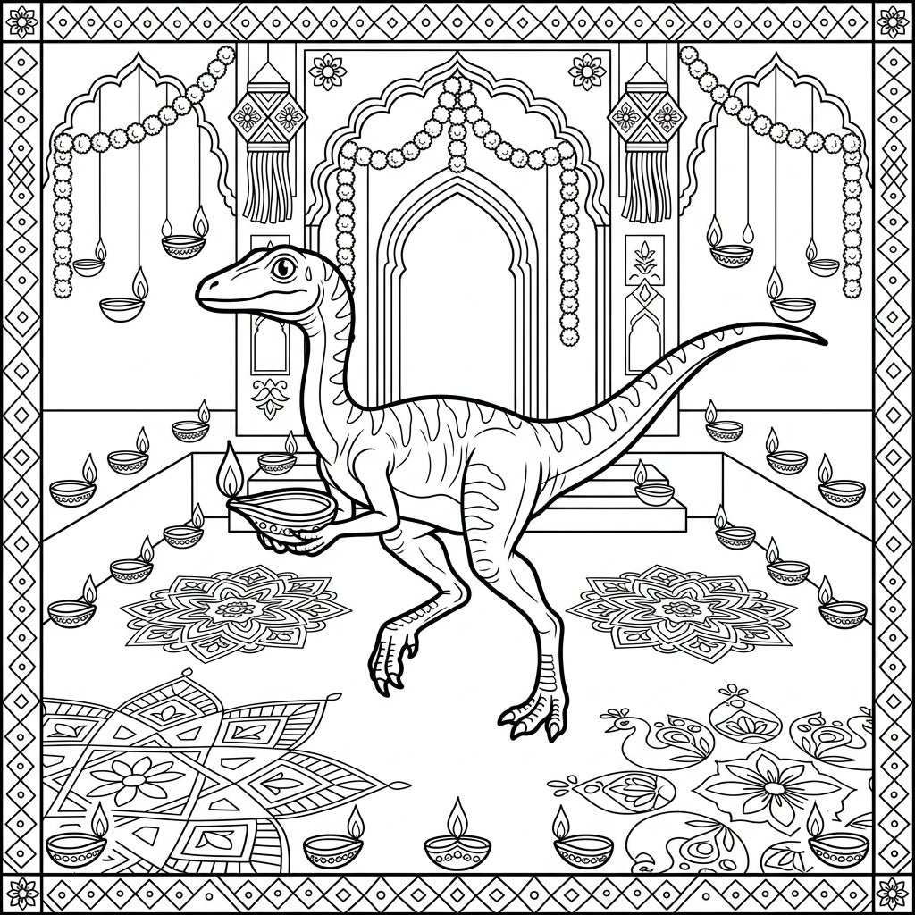 Embark on an extraordinary coloring adventure featuring a nimble Compsognathus dinosaur, a fascinating creature from the Jurassic period, celebrating the joyous festival of Diwali. This intricately designed coloring page showcases our dinosaur friend standing proudly amidst a beautifully decorated setting, holding a traditional diya lamp, ready to illuminate the festivities. The background is adorned with ornate Indian arches, flowing garlands of beads, and charming hanging lanterns, all creating a rich and immersive scene.