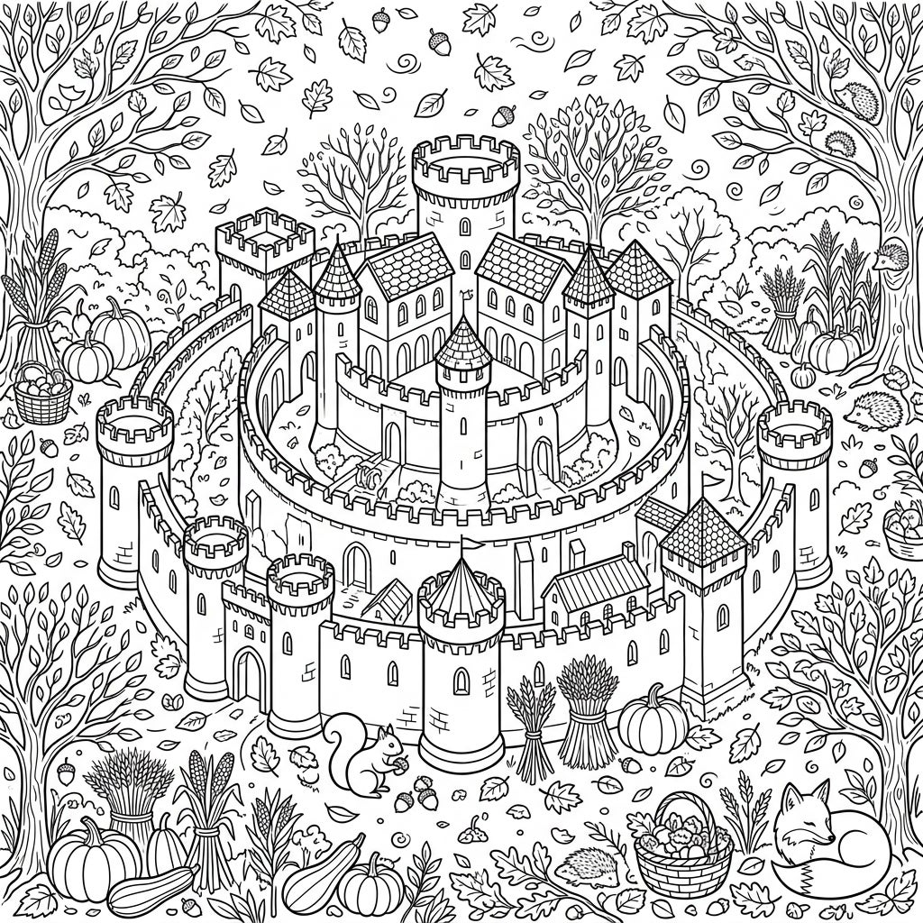 Step into a magical autumn realm with this intricate concentric castle coloring page. Discover a medieval fortress surrounded by charming fall foliage and woodland creatures, ready for your creative touch.