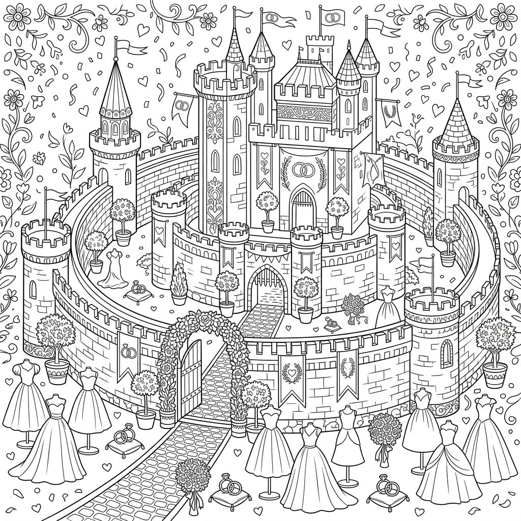Embark on a magical coloring journey with this stunning concentric castle, lavishly decorated for a grand wedding celebration. Discover intricate details and romantic elements that promise hours of creative joy.