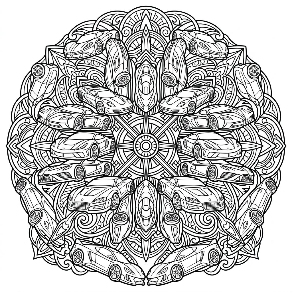 Whether you prefer colored pencils, markers, or gel pens, this intricate design provides endless possibilities for shading and blending. Experiment with metallic finishes for the car bodies, or choose a vibrant palette to highlight the mandala's complex layers. Take your time to appreciate the high geometric precision and let your imagination drive you through this captivating coloring adventure. Download now and start your journey into a world where art meets automotive brilliance!