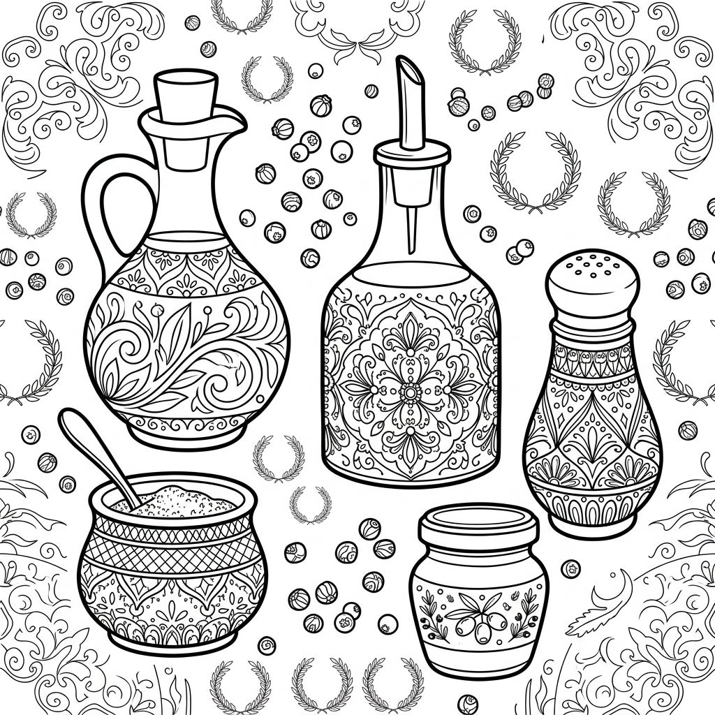 Dive into the detailed world of kitchen essentials with this sophisticated adult coloring page. Featuring beautifully patterned condiment holders, it promises a relaxing and rewarding artistic challenge.