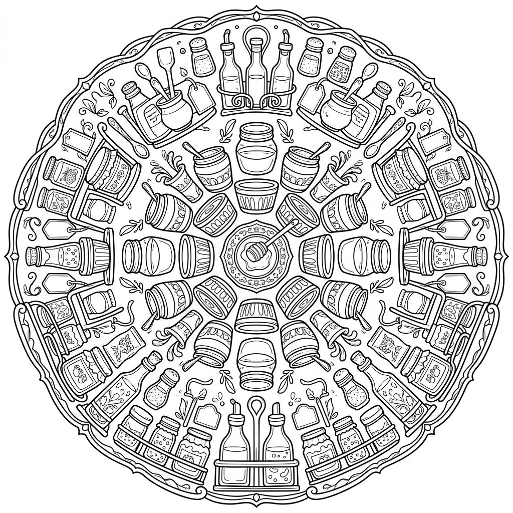 Dive into a world of organized culinary charm with our Condiment Holders Mandala coloring page. This beautifully symmetrical design showcases an intricate radial pattern, where each segment features an assortment of essential kitchen items. From classic salt and pepper shakers to elegant oil and vinegar cruets, charming jam jars, and inviting honey pots complete with dippers, every element is meticulously rendered in detailed line art, inviting your creative touch.