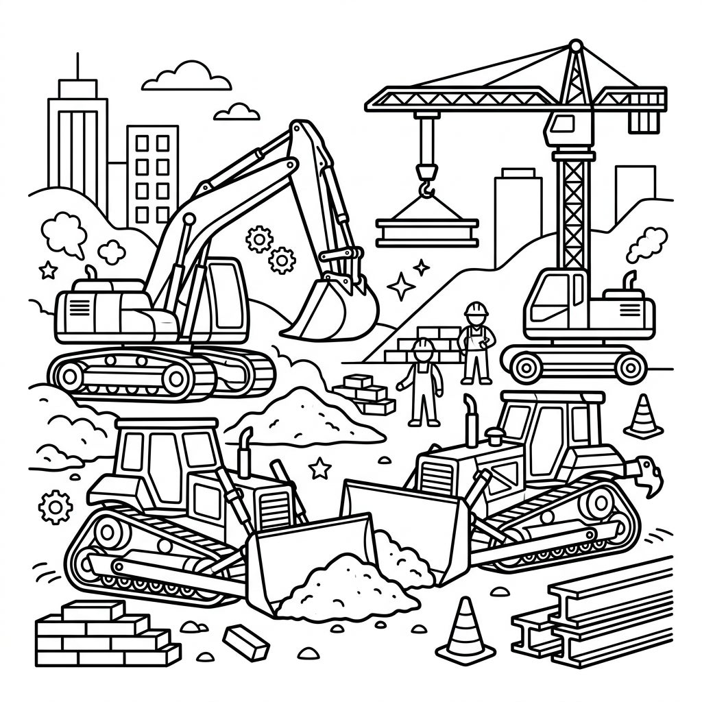 Get ready for a bustling day at the construction site! This engaging coloring page features an impressive excavator digging into piles of dirt, two powerful bulldozers pushing material, and a towering crane meticulously lifting heavy beams. You'll also spot diligent construction workers in hard hats, stacks of bricks, and essential safety cones, all set against a backdrop of city buildings.
