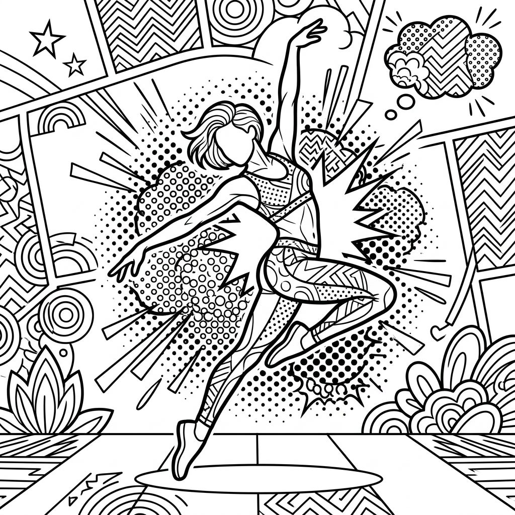 Immerse yourself in the vibrant world of movement with this unique Contemporary Dance Pop Art coloring page. Capture the energy of a dancer in mid-action, surrounded by bold patterns and comic-book inspired details, ready for your artistic touch.