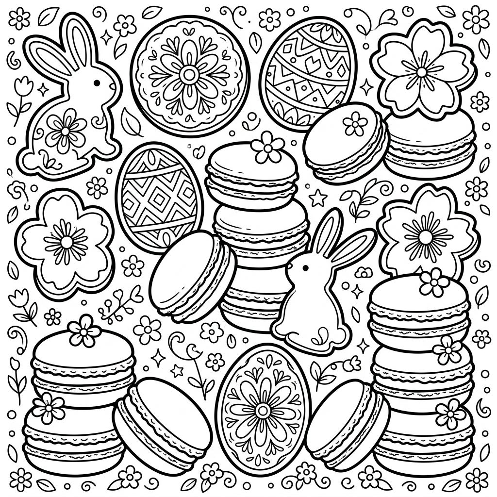 Hop into spring with this adorable Easter coloring page featuring a festive array of cookies and macarons. Discover delightful bunny shapes, beautifully decorated egg cookies, and stacks of sweet treats ready for your creative touch.