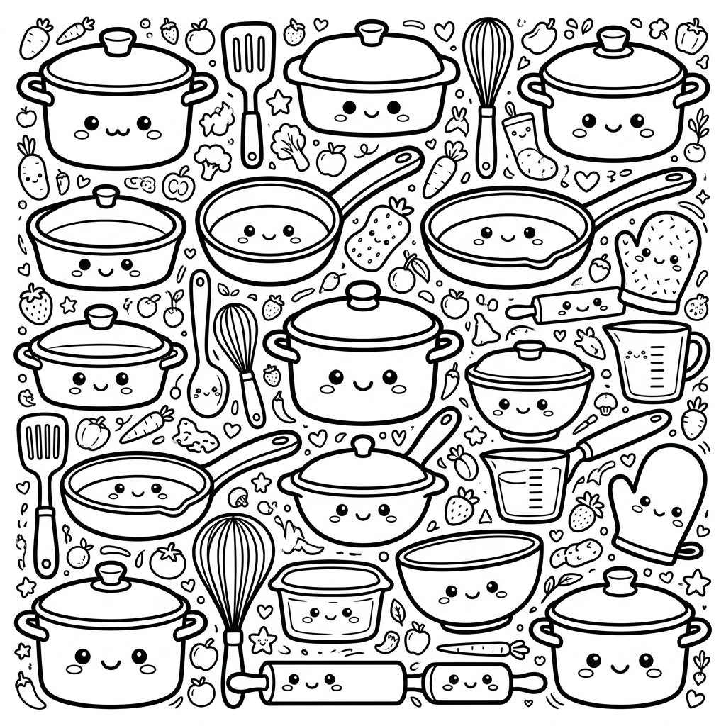 This delightful coloring page brings the kitchen to life with an array of Kawaii-style cookware and bakeware. Discover charming pots, happy pans, cheerful spatulas, playful whisks, and even smiling oven mitts, each meticulously designed with thick, bold outlines and wonderfully rounded shapes. Every kitchen gadget features its own adorable face, inviting you to add your personal splash of color to their cheerful expressions.