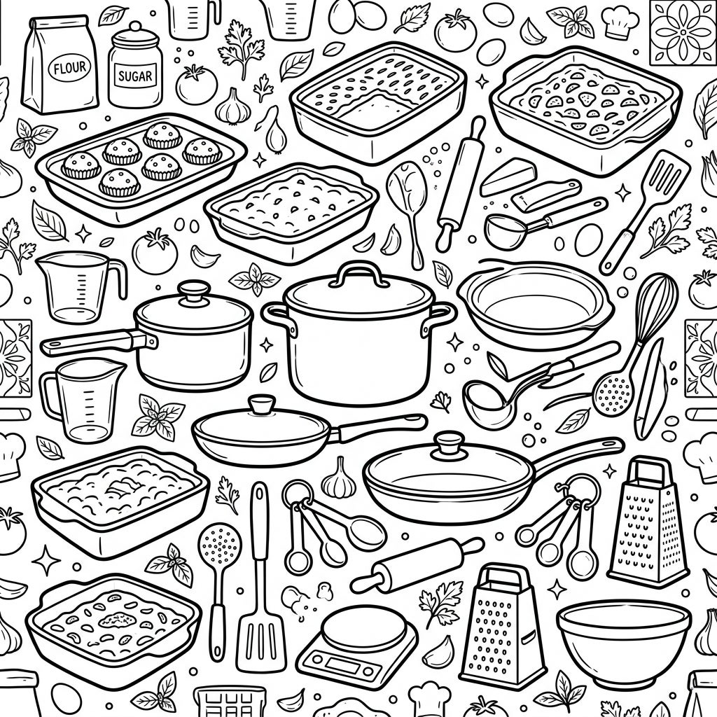 Step into a bustling culinary world with our detailed Cookware & Bakeware coloring template. This intricate page is a celebration of all things kitchen, densely packed with an amazing array of essential tools and vessels. From sturdy pots and versatile frying pans to baking dishes brimming with delicious possibilities and muffin tins ready for treats, every corner reveals a new utensil waiting for your creative touch.
