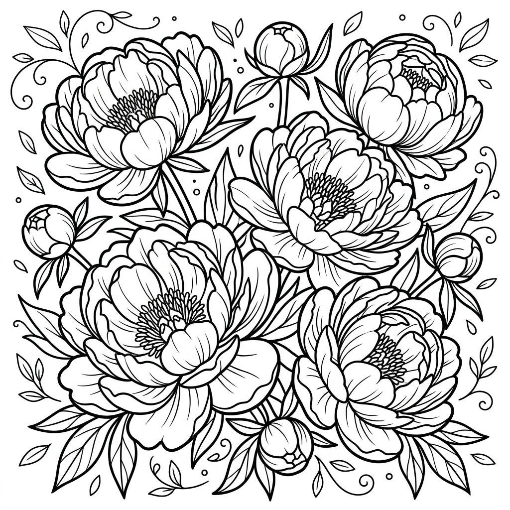 Immerse yourself in the captivating beauty of our Coral Peonies coloring page, meticulously crafted for a relaxing artistic experience. This intricate design showcases a generous bouquet of fully bloomed peonies, accompanied by delicate buds and graceful foliage, all framed by elegant swirling botanical accents. The composition fills the entire space, featuring large print and clear, thick outlines to ensure every detail is easily visible and enjoyable to color.