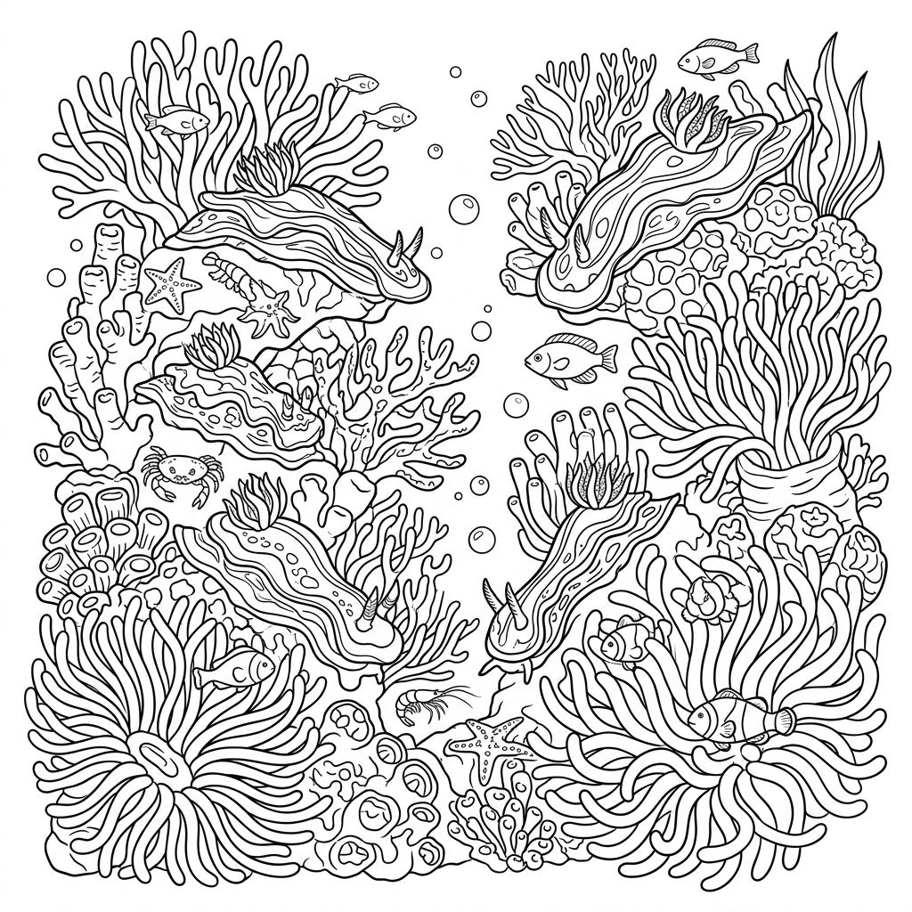 Delve into a stunning black-and-white illustration teeming with the wonders of a coral reef. This detailed coloring template showcases a rich tapestry of marine life, featuring elegant sea slugs (nudibranchs) gracefully navigating through intricate coral formations. You'll discover various types of anemones with their swaying tentacles, schools of curious fish, a scuttling crab, delicate starfish, and even a tiny shrimp, all harmoniously coexisting in this vibrant underwater scene.