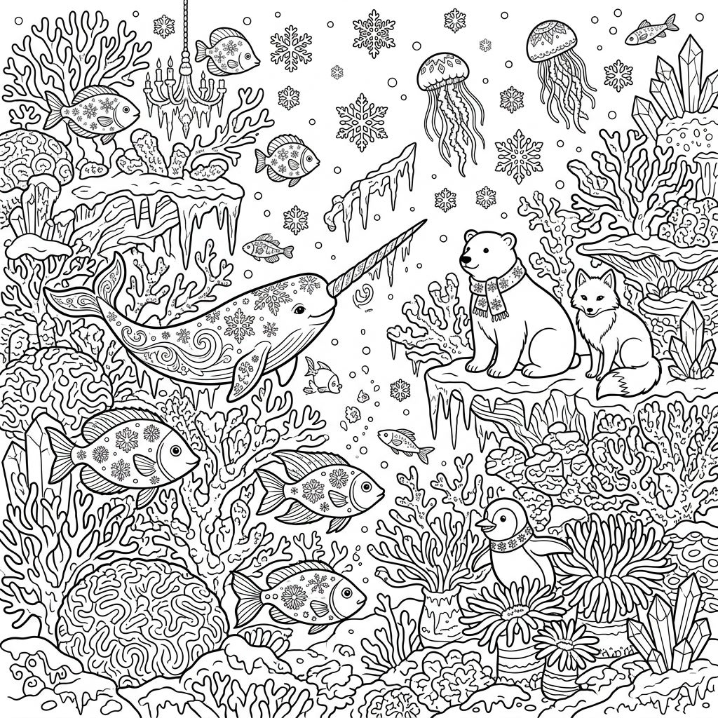 Unleash your creativity with this wonderfully detailed coloring page, featuring a fantastical 'Coral Reef Winter Wonderland'. Journey beneath the waves to discover a vibrant ecosystem where delicate coral formations are adorned with shimmering icicles and intricate snowflakes. Majestic narwhals, playful arctic foxes, a charming polar bear in a scarf, and a delightful penguin join the scene, mingling with unique fish patterned with frosty designs and ethereal jellyfish, all under a flurry of falling snowflakes.