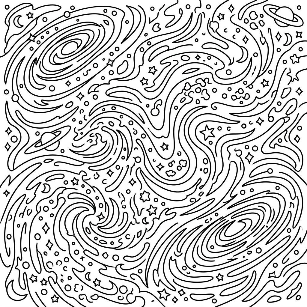 Embark on an imaginative journey through space with this captivating cosmic dust patterns coloring page. Designed with young explorers in mind, this intricate illustration features a dynamic interplay of abstract swirling lines, representing distant galaxies and nebulae. Interspersed among the flowing patterns are delightful celestial elements like twinkling stars, crescent moons, and small ringed planets, creating a rich tapestry of the cosmos.