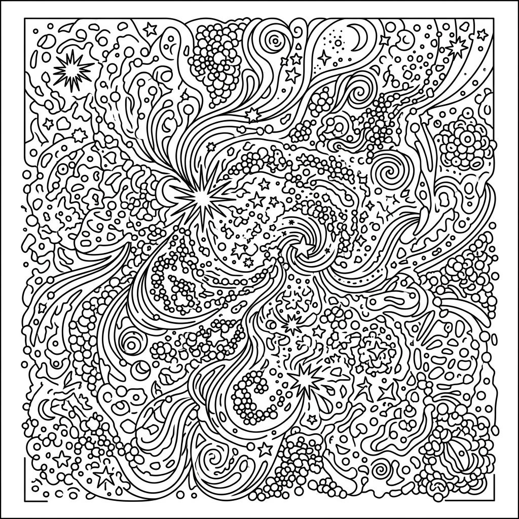 Dive into a universe of intricate detail with our Cosmic Dust Patterns coloring page. This mesmerizing design features a rich tapestry of swirling lines, tiny nebulae-like clusters of dots, shimmering stars, and delicate crescent moons, all interwoven to create an abstract celestial landscape. Every inch of the square frame is densely packed with elements, offering an extensive and rewarding coloring challenge that invites close attention and creative exploration.