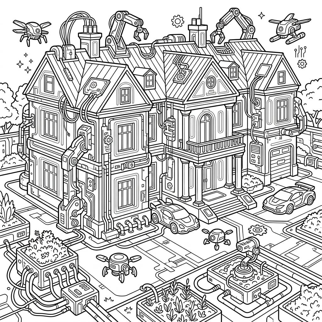Immerse yourself in a fascinating fusion of past and future with this intricate coloring template. This grand country mansion has undergone a radical cyberpunk transformation, featuring a stunning array of technological additions. Observe the powerful robotic arms extending from the roof, the complex network of wires and circuits tracing the exterior walls, and sophisticated tech panels integrated into the very structure. Below, sleek, futuristic vehicles are parked on a dynamically patterned driveway, while advanced drones hover gracefully in the air, completing this high-tech landscape.