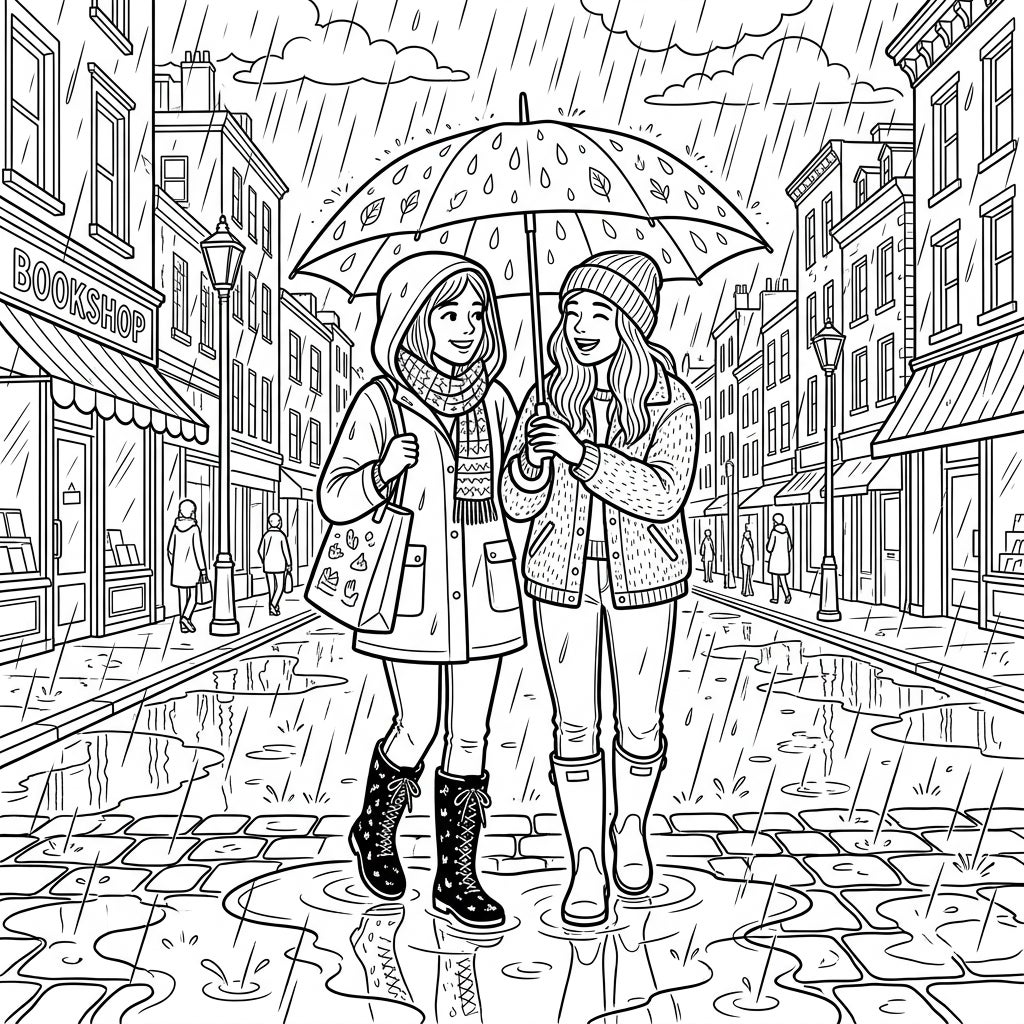 Immerse yourself in this charming coloring page, depicting two happy individuals enjoying a rainy day stroll. They walk arm-in-arm under a shared umbrella, their expressions reflecting warmth and companionship, dressed in cozy raincoats, scarves, hats, and sturdy boots. The detailed streetscape features quaint buildings, including a prominent 'BOOKSHOP,' cobblestone paths, and shimmering puddles that beautifully capture the reflections of the urban environment.
