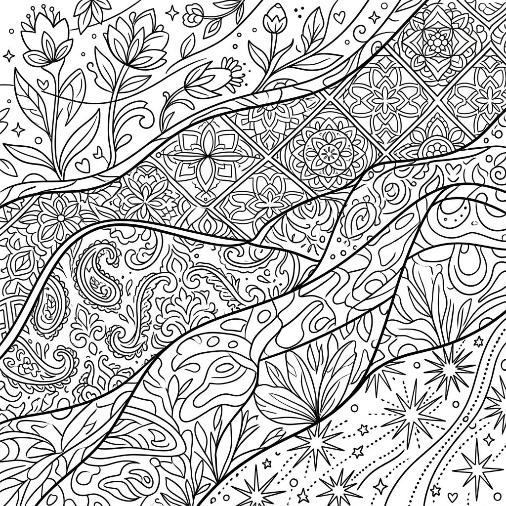 This captivating coloring page features a dynamic composition of wavy bands, each showcasing a unique pattern reminiscent of luxurious textile coverlets. From delicate floral sprays with budding blossoms and tiny hearts, to intricate geometric mandalas enclosed in diamonds, and classic flowing paisley motifs, every section invites careful observation. Further bands present organic, abstract swirls alongside starry bursts and leafy elements, creating a rich tapestry of design waiting for your personal touch.