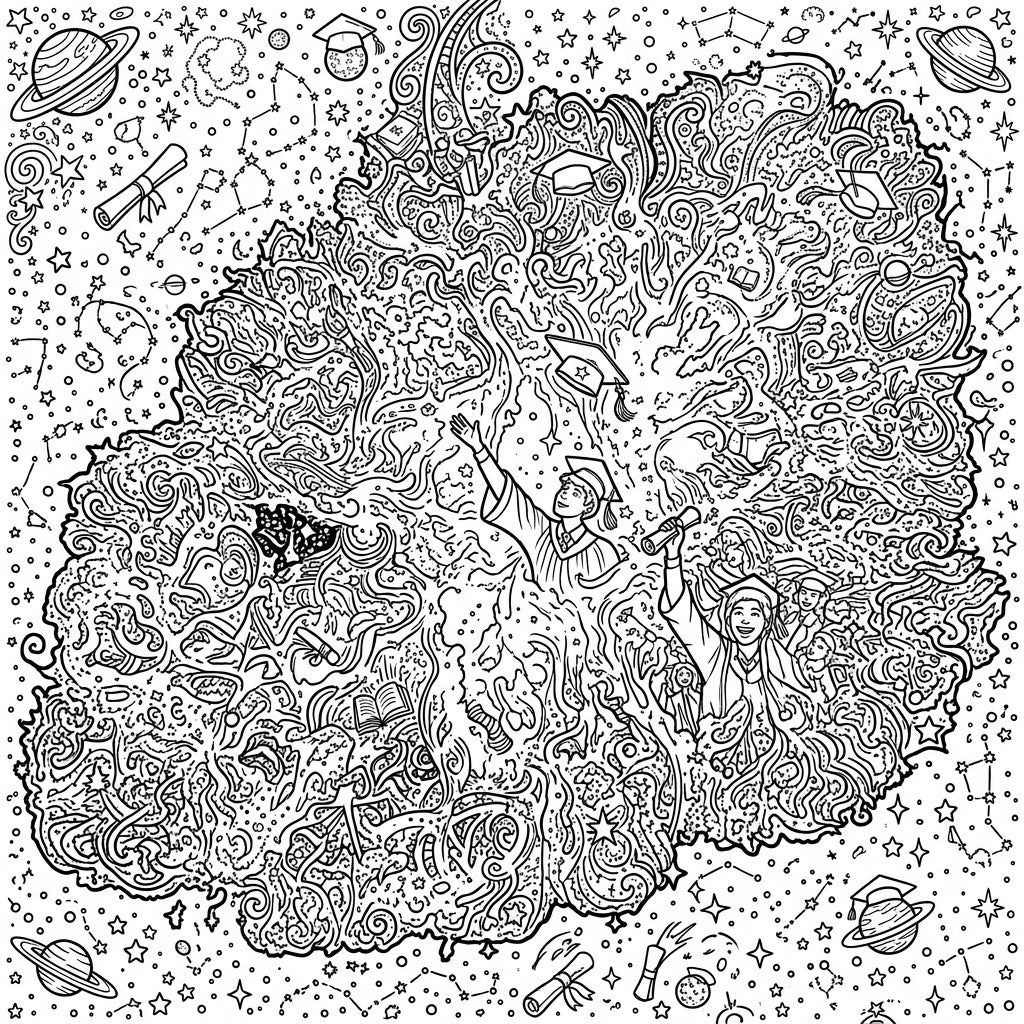 Unleash your creativity and bring this celestial celebration to life with your favorite colors. Experiment with vibrant hues for the nebula's gases, perhaps fiery reds, deep purples, and shimmering blues, contrasting with the traditional colors of graduation attire. Add metallic pens for the stars and planets, or use soft pastels to create a dreamlike atmosphere. Don't forget the details: bring out the intricate patterns of the cosmos and the academic symbols with precision, making each element sparkle with its own unique flair. This page offers endless possibilities for a truly stellar coloring experience!