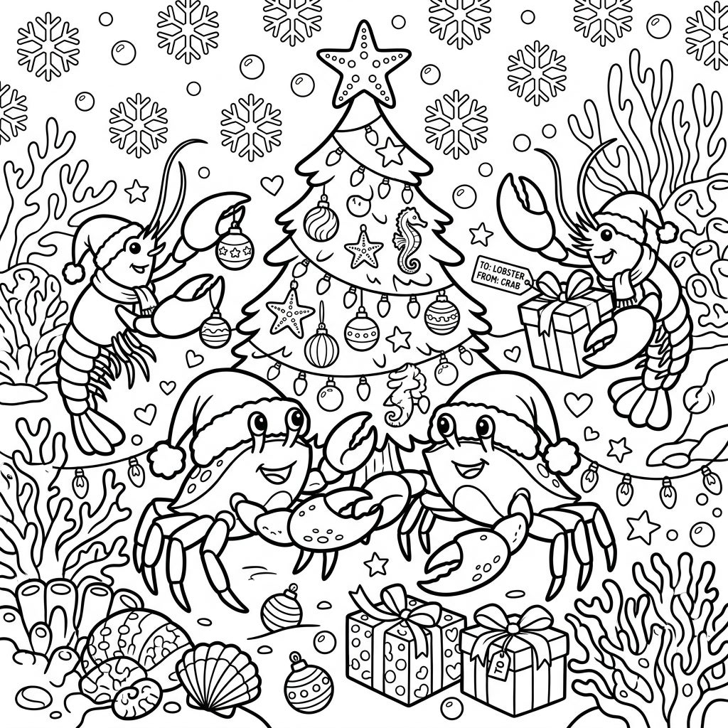 Get ready for a unique holiday celebration with our delightful Crabs & Lobsters Christmas coloring page. Watch as these cheerful crustaceans adorn a festive underwater tree and exchange gifts, bringing joy to your coloring session.