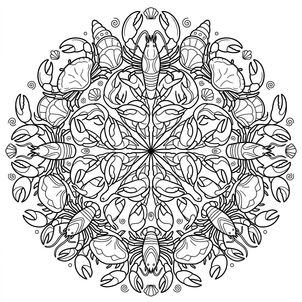 Embark on an artistic voyage beneath the waves with our exquisite Crabs & Lobsters Mandala coloring page. This intricate design masterfully weaves together the fascinating forms of hard-shelled crabs, elegant lobsters, and delicate seashells into a breathtakingly symmetrical radial pattern. Each element is meticulously outlined, forming a mesmerizing circular composition that invites both precision and imaginative exploration.